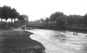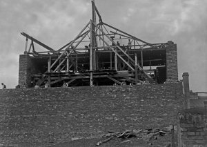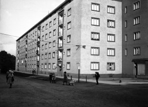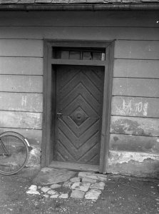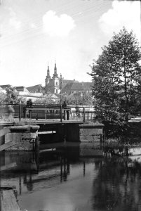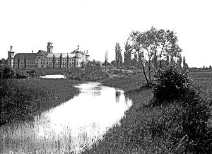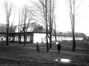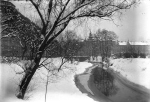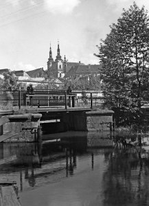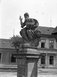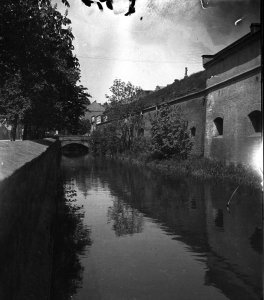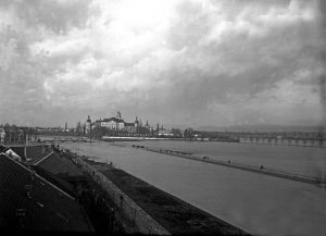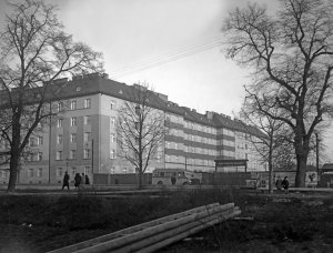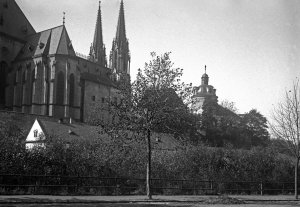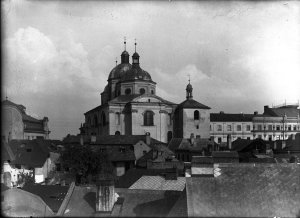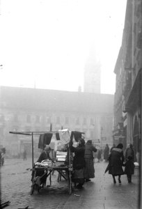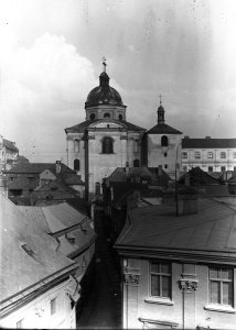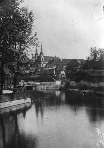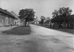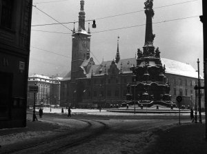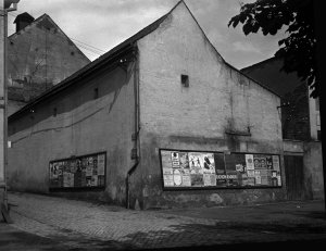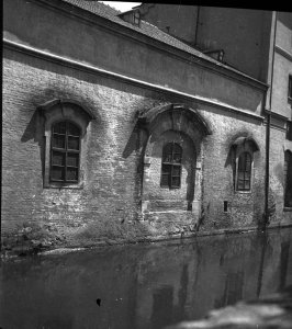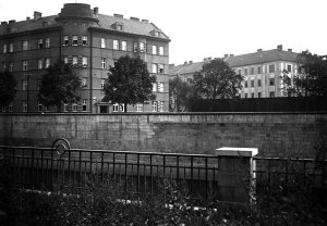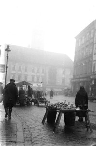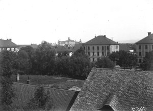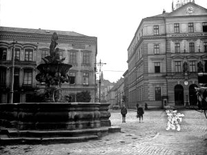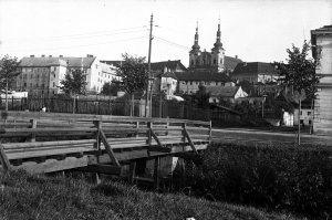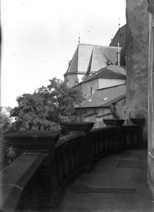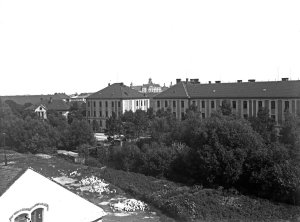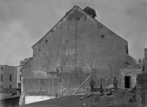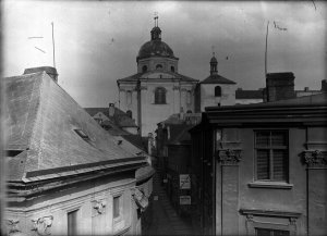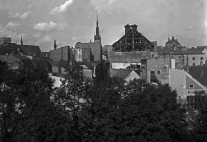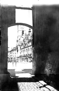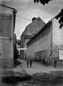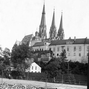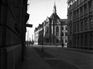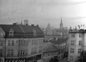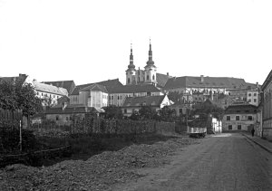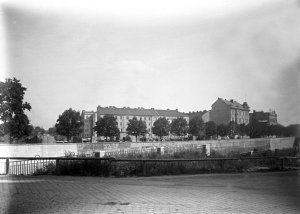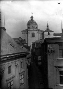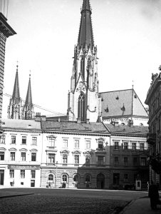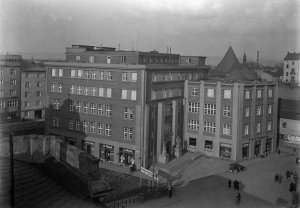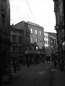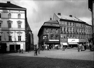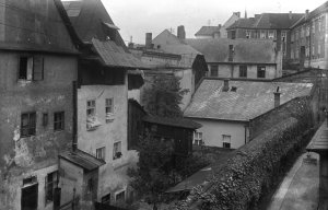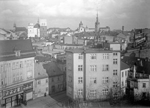 Pohled ze sz., z dnešní Franklinovy ulice na domy v Koželužské ulici, v pozadí zleva doprava: klášter Klarisek, domy v Pekařské ulici: č.o. 47 Mořice Donatha, dnes Muzeum umění, a domy č.o. 45, 43, 41, v pozadí kostel P. M. Sněžné a Jezuitský konvikt