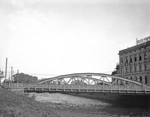 Ocelový příhradový obloukový most přes řeku Moravu na dnešní Masarykově třídě, vpravo část budovy s nápisem na střeše Julius Kremer, Vogelkäfigfabrik