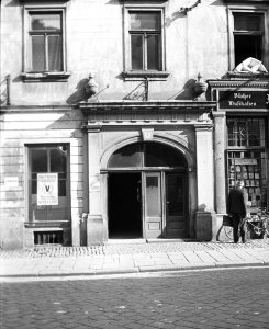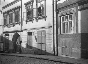 Olomouc, Pekařská ulice, dům č.o. 9, portál, ve výkladu plakát "V Viktoria" (4.5x6 cm stav: dobrý)