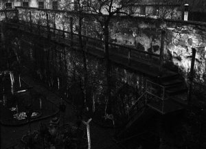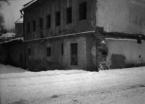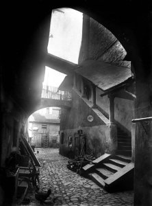 Nově proražená ulice Zámečnická, detailní pohled na dvorní trakt domu z bývalé ulice Fratiškovo stromořadí (4.5x6 cm stav: dobrý)