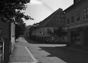 Nové Město pod Smrkem, dřevěné domy v ulici (4.5x6 cm stav: dobrý)