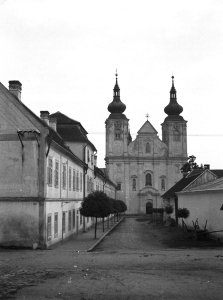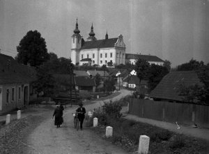 Nová Říše, premonstrátský klášter a průčelí kostela z obce
