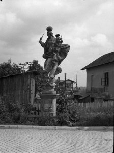 Nová Ulice, kostel Panny Marie Pomocnice, vlevo socha sv. Jana Nepomuckého, vpravo kříž s Ukřižovaným (9x12 cm stav: dobrý)