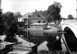 nový tzv Kateřinský most přes Střední Moravu, v popředí sádky, v pozadí bývalé mýto, za ním hostinec Wanderer (13x18 cm stav: dobrý)
