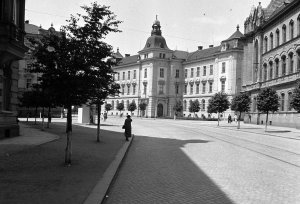Palackého třída, v popředí Pötingeum, v pozadí bývalé Finanční ředitelství (4.5x6 cm stav: dobrý)
