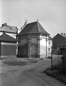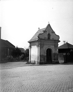 Nový Svět, kaplička na křižovatce Holické a Přichystalovy, přední průčelí (4.5x6 cm stav: dobrý)
